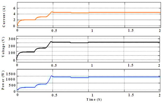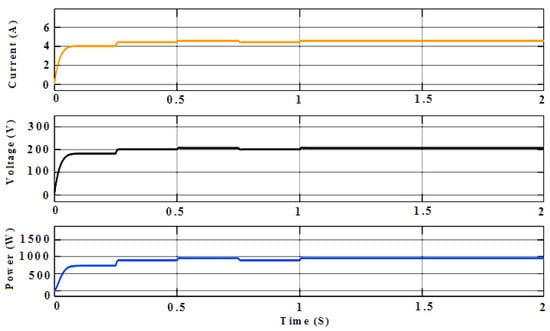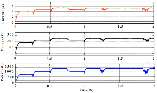 P&O-based MPPT output power, output voltage, and output current (Vin = 100 V, Iin = 8.6 A, D = 0.5,Vout = 200 V, Iout = 4.3 A, and Pout = 860 W).