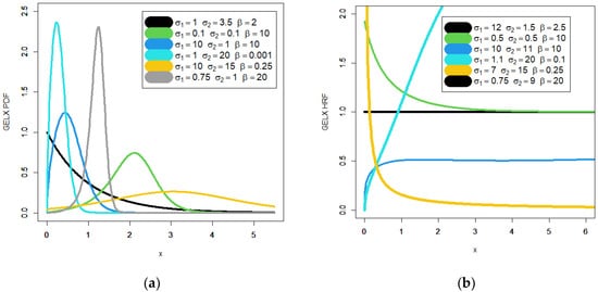 where are two additional shape parameters. Henceforth, GELX() denotes an RV having density function (4). The reliability function (rf) and hazard rate function (HRF) of are, respectively, given by , where
