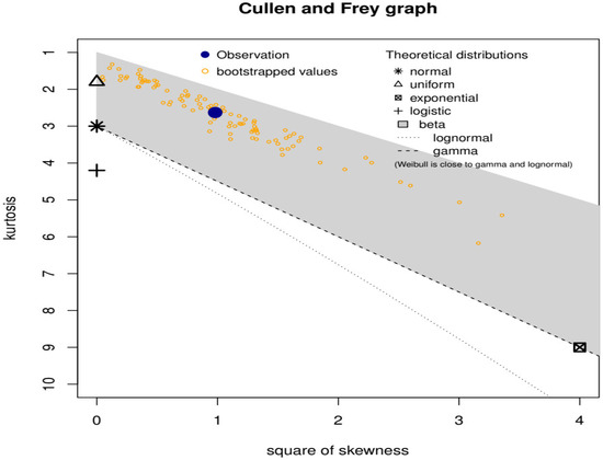 In addition to numerical research, graphical methods are employed to look at how theoretical distributions initially fit and how the densities of actuarial claims take shape. The Cullen and Frey plot helps identify whether a dataset deviates from a normal distribution. Understanding the distributional characteristics of data is crucial in many statistical analyses, as assumptions about normality often underlie many statistical tests. Skewness, which is represented on the x-axis of the plot, measures the extent to which the data distribution is asymmetric. Positive skewness indicates a longer right tail, while negative skewness suggests a longer left tail. The plot helps visualize and quantify the skewness of the dataset. Kurtosis, shown on the y-axis of the plot, measures the degree of peakedness or flatness of a distribution compared to a normal distribution. High positive kurtosis implies heavy tails, while negative kurtosis suggests lighter tails. Analyzing kurtosis helps us understand the presence of outliers or extreme values in the dataset. Figure 2 gives the Cullen and Frey plot for actuarial claims data. The Cullen and Frey (skewness–kurtosis plot) in Figure 2 reveals that the data are left-skewed with a kurtosis of less than 3. The big blue dot refers to our insurance data. It is clear that the data stay away from the main points which represent normal distribution and exponential distribution. Also, our insurance data are away from the lines which represent gamma distribution and lognormal distribution. By projecting vertically to those lines, we can see that the data have lower kurtosis than the lognormal and the gamma models of the same skewness.