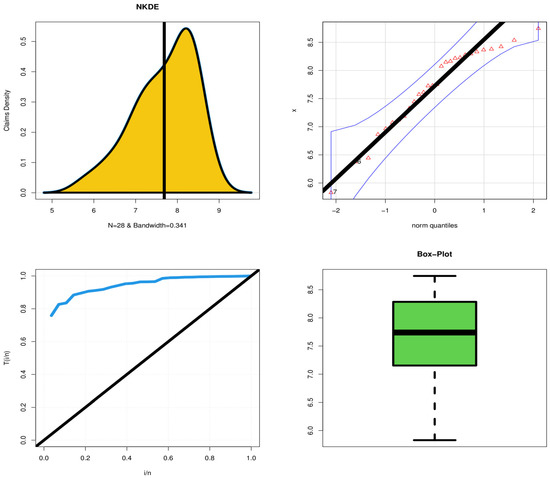 The nonparametric kernel density estimation (NKDE) method (top left), the quantile-quantile (Q-Q) plot (top right), the total time on test (TTT) plot (bottom left), and the “box plot” (bottom right) are only a few of the graphical techniques shown in Figure 3 below.