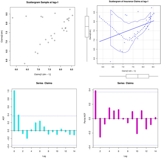 Scattergrams (top left and top right), ACF (bottom left), and practical ACF (bottom right) for the actuarial claims data.