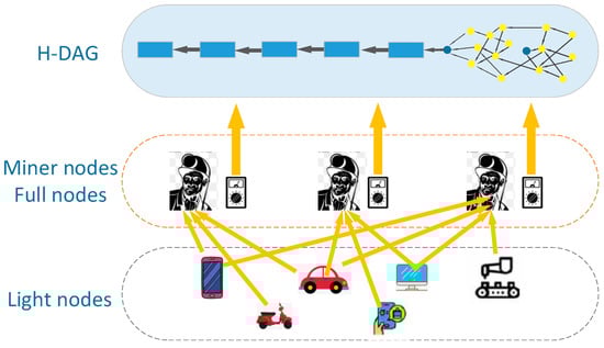 The H-DAG network structure of the hybrid blockchain based on a DAG is shown in Figure 1. The nodes in a network are divided into full nodes and light nodes. Full nodes store all blockchain information, collect all transactions on the web, and restrict blocks from participating in mining. They are also called miner nodes []. Light nodes send transactions in blockchain networks and include mobile phones, sensors, and other terminal devices. These devices often do not have high computing power and storage capacity and cannot save all the information of a blockchain to participate in mining []. Therefore, light nodes must interact with whole nodes to participate in a blockchain network.