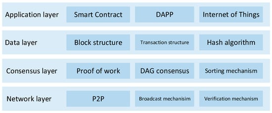 This framework is based on the open-source framework of Ethereum and modifies its trading pool, trading structure, block structure, and consensus mechanism, as well as other parts. The trading structure adopts a DAG structure based on the reference relationship. The consensus algorithm modifies the PoW of Ethereum. The overall architecture of an H-DAG is shown in Figure 2, which is divided into application, data, consensus, and network layers [].