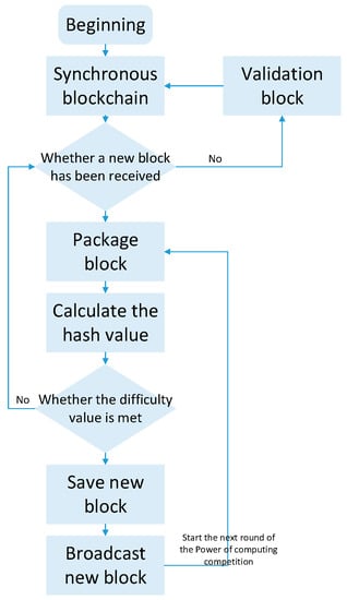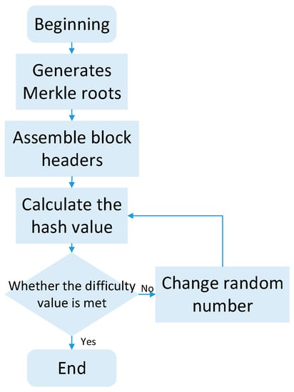 The process of nodes joining a blockchain network for the first time is shown in Figure 3. The nodes first request the neighboring nodes in the network to synchronize the blockchain data. After verifying and synchronizing all block data, the nodes compete for computing power and participate in mining as full nodes. The part of the DAG connected by the current Genesis node is packaged, and the Merkle tree is calculated according to the transactions in the DAG. The Merkle root, block hash value, difficulty value, timestamp, and version information are then packaged into the block header. The hash value of the current block is then calculated. If the hash value of the block exceeds the difficulty value, the random number must be changed and recalculated until the hash value is less than the difficulty value and a legal block is found. This process is shown in Figure 4. In the competition for computing power, the whole node is required to monitor the information in the network, accept and verify the transactions on the web, and then broadcast the transactions.
