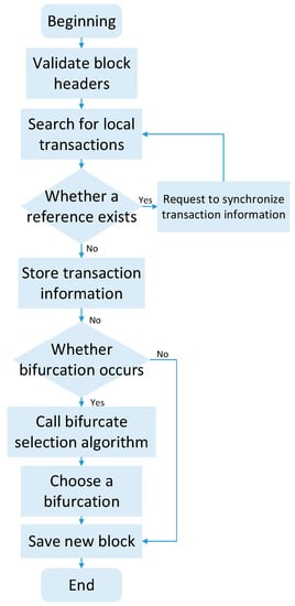 When a miner receives two blocks of the same height at the same time or a synchronous blockchain, the difficulty of the value of all partnerships in each fork and the synthesis of the difficulty value of the block containing the transactions are counted. The chain with the most significant difficulty value is obtained as the main chain. The process is shown in Algorithm 1.