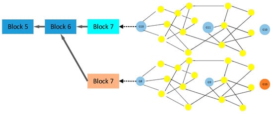 When the fork height was greater than 3, the Genesis node at this time was generated by the block mined by the attacker. The attacker was required to simultaneously fight against the final force of other miners as well as all transaction senders in the network by connecting a large number of transactions behind its Genesis node to increase the block difficulty value. The blockchain state at this time is shown in Figure 7. The probability that the attacker successfully forked into the main chain is shown in Formula (4).