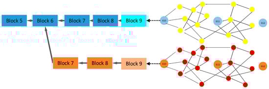 where t is the block production time set by the blockchain. The average block production time of n blocks in the past is followed and the difficulty value is dynamically adjusted to ensure that the average block production time is stable at time t. When the current time is t1, the whole network agrees upon block 7, and miners compete for the permissions to block 8. The timestamp of Genesis node 10 contained in block 7 is then t1 + 2 ∗ t. In an ideal situation, the interval between the timestamp of Genesis node 9 and block 7 is t. After time t, the current time is t1 + t, and the mining competition time of block 8 is t. Ideally, the whole network should calculate and agree upon block 8. In this way, all nodes in the asynchronous system receive the majority of the transaction information. When the network status is incorrect, the latest Genesis node can be selected to ensure that all nodes in the network have enough broadcast time to receive the transaction. Transactions sent by each node are packaged in fixed blocks. For example, transactions connected at Genesis node 8 are packaged in block 8; therefore, only block 8 is required to be read to identify if a transaction has been confirmed.