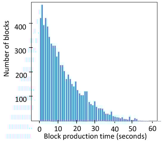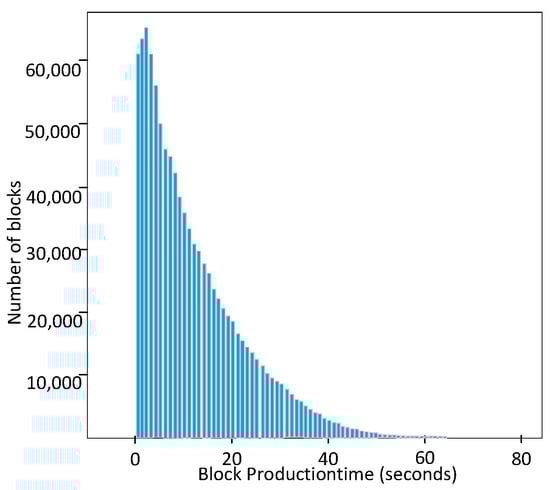 where the random variable x is the time required to generate α blocks. The beta is λ in the exponential distribution formula, which we approximated as the average block generation time. We analyzed the block distribution when the block production time was set at 10 min and 15 s, as shown in Figure 10 and Figure 11.