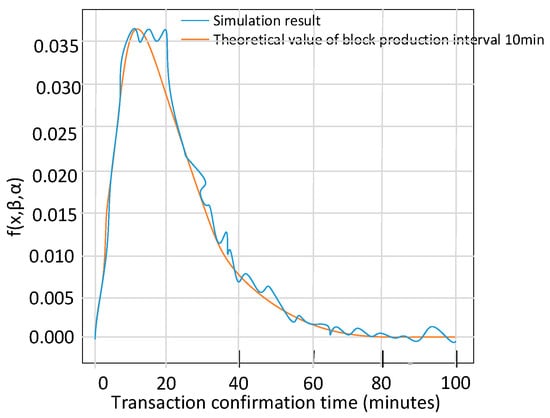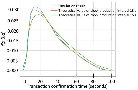 We observed that under the PoW consensus mechanism, the block-out time presented an apparent exponential distribution. When this was combined with the conclusion of [], we judged that the block-out time followed the exponential distribution of λ = (average block-out time). In our structure, sending a transaction required the creation node to be selected; thus, the transaction only appeared on a particular block. The time a transaction was recorded on the blockchain could be estimated based on the probability distribution of the block production. In an H-DAG, when a transaction is sent at any time, the miners of the network compete for the last block. After selecting a Genesis node and sending the marketing, they are required to wait for one or two blocks before they can query their transaction in the following block. At this time, the transaction is recorded on the chain. If the available closest creation node is selected, the transaction is recorded on the chain two blocks later. After the transaction is sent, two blocks are created in the blockchain, and the transaction is recorded in the second block. Due to the block time obeying an exponential distribution, the risk of multiple blocks should abide by the gamma distribution. This should confirm the relationship between the time interval and a piece of f (x β, α).