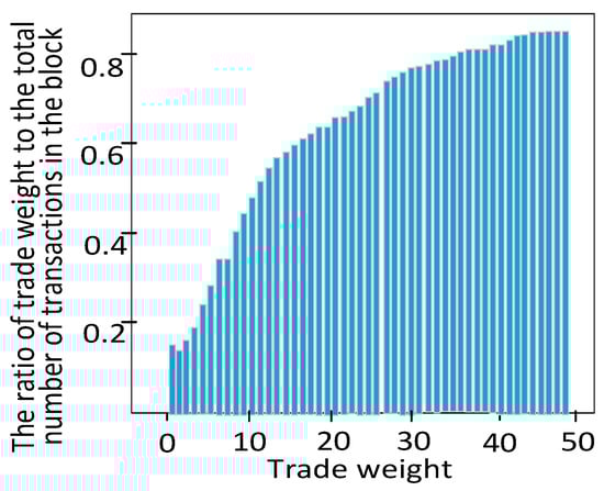 Figure 12 shows the ratio of the total number of quoted transactions and quoted transactions of each exchange in 1000 blocks to the total number of all transactions contained in the block. With an increase in the number of transactions, the number of quoted transactions of each transaction accounted for an increasing proportion of the total number of transactions in the block. The number of unacknowledged transactions at the end of the DAG fluctuated around a constant. Thus, the appropriate trades were referenced by most exchanges while ensuring that the directed acyclic graph formed between transactions had extended.