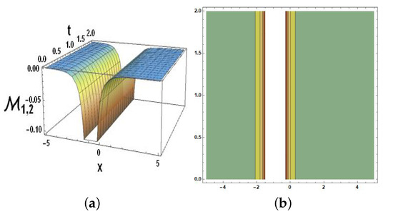 (ii) Only the stages of the two solitons that collided have changed, and they are now opposite. As a result, we conclude that the collisions of two solitons become elastic. For a solution to Equation (68), with the parameters and , Figure 16 shows the significant two-soliton configurations of and . From this, we can see that part is an exceptional two-soliton framework, while part is a dark two-soliton framework.