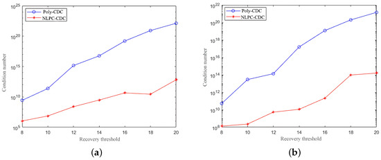 To improve numerical stability, a novel NLPC-based CDC was proposed. A detailed design were executed for both matrix–vector and matrix–matrix multiplications. An associated proof that the constructed code possesses an -symmetrical combination property (CP) was provided. A series of numerical studies verified that our proposed NLPC-CDC significantly outperforms Poly-CDC in terms of the achieved condition number or relative error, and the improvement was over for all cases. This work adopted random interpolation points, without careful selection of real interpolation points. Therefore, future work may consider selecting appropriate interpolation points to obtain the best numerical results, which variants may outperform the Poly-CDC variants [17,18]. In addition, as the encoding procedure is complicated and tedious, we may consider designing a simple encoding method that can maintain numerical stability.