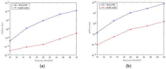 Relative error: The size of matrix and column vector are and , respectively. We set m to range from 10 to 30. The relative error of the results is plotted in Figure 4. The observations show that NLPC-CDC significantly outperforms Poly-CDC.