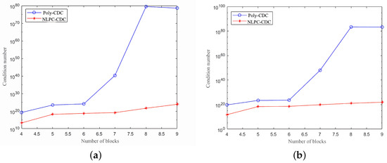 Condition number: The size of matrix and are and , respectively. We set the number of blocks m to be from four to nine. A random number in is selected as the interpolation point. By averaging over 50 realizations, the condition numbers of Poly-CDC and NLPC-CDC vs. m are plotted in Figure 5, for and , respectively. The observations show that the condition number of Poly-CDC increases rapidly when the number of blocks exceeds six, while the condition number of NLPC-CDC grows very slowly for both scenarios, and , indicating significant improvement of NLPC-CDC over Poly-CDC.