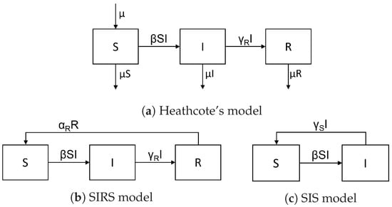In this Section we introduce notation and terminology and shortly review Hethcote’s classic results [2,3,4,5]. Replacing , Hethcote’s model in Figure 2 leads to the dynamic system