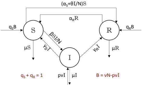 Flow diagram of the SI(R)S model. denotes the number of not infected newborns per unit of time.