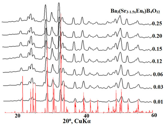 Powder X-ray diffraction patterns of the Ba3(Sr3−1.5xEux)B4O12 phosphors. Red lines mark the calculated powder XRD pattern of Ba3Sr3(BO3)4.