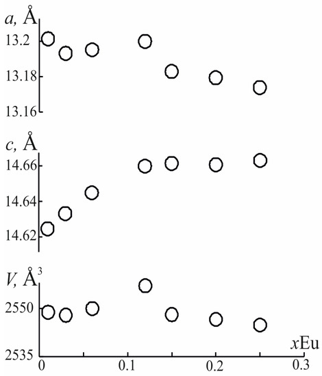 Powder XRD patterns for all studied samples are shown in Figure 1. The samples are homogeneous and peaks correspond to the calculated XRD patterns of Ba3(Sr3−1.5xEux)B4O12 borates in accordance with data [23]. Unit cell parameters were refined by the Rietveld method in the RTT program software (v.2). The a parameter is decreased with the increase in Eu content as well as the volume V of the Ba3(Sr3−1.5xEux)B4O12 phosphors, due to the difference in the ionic radii of the Sr ([7]1.35 Å) and Eu ([7]1.15 Å) ions [32] (Figure 2), while the c parameter is increased slightly to about x = 0.10–0.15 Eu3+, but practically does not increase further. It could be assumed that the inflection point may be caused by a partial redistribution of Eu ions over Sr(1) and Sr/Ba(1) sites, as occurred in Ba3Lu2B6O15 [19].