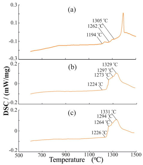 DSC heating curves of x = 0.15 and x = 0.25 samples are very similar (Figure 3b,c), although they differ from the curve with x = 0.03. They demonstrate broadened overlapping peaks of solid solutions melting (Figure 3b,c). The thermal effects start at 1224 and 1226 °C for x = 0.15 and x = 0.25 samples, respectively. Apparently, these peaks (maxima at 1267 and 1264 °C) correspond to solidus temperatures, while the final maxima (1329 and 1331 °C) are liquidus temperatures. Intermediate insignificant peaks are attributed as recrystallization due to reaction of the solid phase and liquid with chemical composition changes for solid and liquid phases. The melting region of solid solutions with a high Eu3+ content (x = 0.15 and 0.25) is narrower than in the case of x = 0.03, which can apparently indicate a change in the structure of the solid solutions.