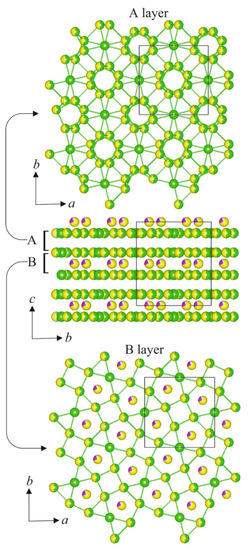 The crystal structures of Ba3(Sr3−1.5xEux)B4O12 phosphors, borates with isolated B–O anions, can be described in terms of the cationic sublattice and belong to the “antizeolite” family of borates [25,28,29,33,34]. This structure is formed by a tetragonal cationic framework of Ba and Sr atoms with square, pentagonal, and triangular cavities (Figure 4, bottom) filled by B–O anionic groups, as in Ba3B2O6 borate [25]. Each square cavity is surrounded by four pentagonal and triangular ones. This framework can be divided into A and B double pseudolayers [34] due to inversion center and mirror plane along the c axis (Figure 4, center). The [B(1)O3] and [B(2)O3] triangular radicals are located in pentagonal and triangular cavities inside A pseudolayers. The Sr(1) is an extraframework cationic site which is located within B pseudolayers.