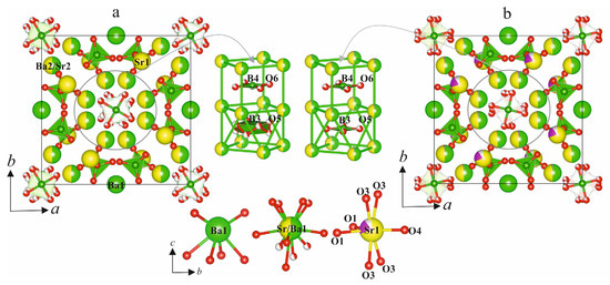 The comparison of Ba3Sr3B4O12 (a) and Ba3Sr2.625Eu0.25B4O12 (b) crystal structures.