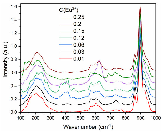 The Raman spectra of the Ba3(Sr3−1.5xEux)B4O12 (x = 0.01, 0.03, 0.06, 0.12, 0.15, 0.20, 0.25) samples are shown in Figure 6. All Raman bands observed in the spectra around 200, 400, 600, and 900 cm−1 correspond to vibrations of BO3 triangles [40]. No bands corresponding to BO4 tetrahedra were found in the Raman spectra, which agrees with structural data. The relatively large width of the Raman bands compared, for example, with LuBO3 single crystal, is explained by the disordered BO3 triangles in the channels along the c axis (Figure 6).