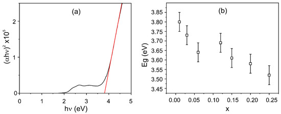 The absorption spectra of the Ba3(Sr3−1.5xEux)B4O12 samples were used to determine the optical band gap in Tauc plot coordinates. Figure 7a shows the example of the Tauc plot for the x = 0.01 sample. The dependence of the obtained optical band gap on the Eu3+ content is shown in (Figure 7b). Like the data in [34], the absorption edge shift depends on the degree of filling of the cationic framework with anionic clusters. The Sr → Eu substitution of the extraframework site affects the absorption edge shift too (Figure 7b). The band gap of the Ba3Sr3B4O12 is 6.10 eV [23] and the band gap for x = 0.01 is 3.80 eV. The band gap reduction may be due to the formation of defective localized states in the band gap upon the incorporation of Eu3+ ions.