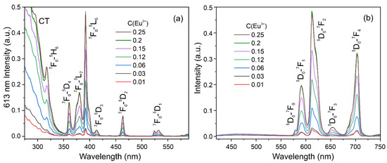 PLE and PE spectra of Ba3Sr3B4O12: Eu3+ samples are presented in Figure 8. All narrow bands observed in the spectra correspond to transitions of Eu3+ ions. The O2−–Eu3+ charge transfer excitation band is observed on PLE spectra below 300 nm. When the photoluminescence of europium is directly excited, the 7F0-5L6 transition is the most effective (Figure 8a). Therefore, PL spectra were obtained under 392 nm excitation.