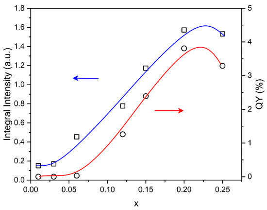 Concentration dependence of the integrated luminescence intensity and PL quantum yield of Ba3(Sr3−1.5xEux)B4O12 samples.
