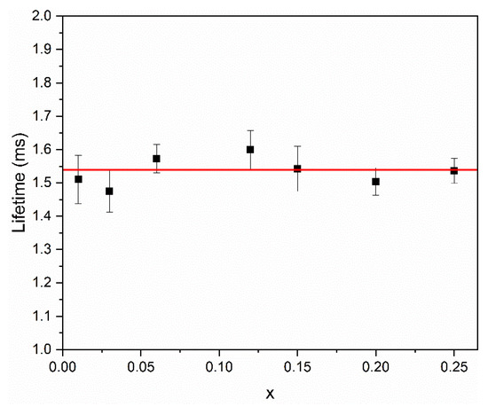 The lifetimes of the 5D0 level of Eu3+ ions were determined from the PL kinetic decay curves for the 5D0-7F2 transition upon excitation at 392 nm. The concentration dependence of obtained lifetimes is plotted in Figure 10. It can be seen that the 5D0 level lifetime of Eu3+ does not depend on the active ion concentration, which indicates the absence of additional channels of excitation or relaxation, such as energy or charge transfer.