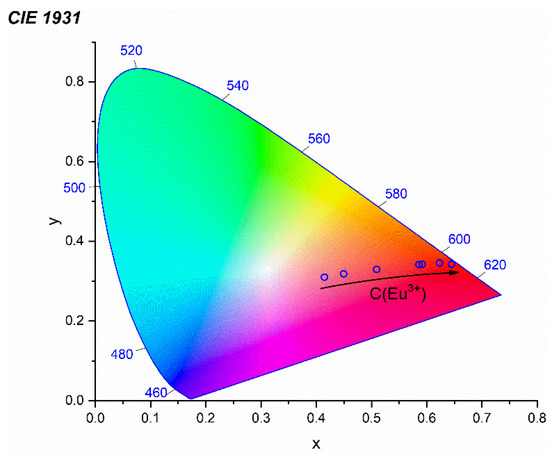 The emission spectra were used to determine the chromaticity coordinates, the values of which are presented in Table 3. The Commission Internationale de I’Eclairage (CIE) diagram is presented in Figure 11. It can be seen that the increase in Eu3+ concentration leads to a shift in color to the red region.