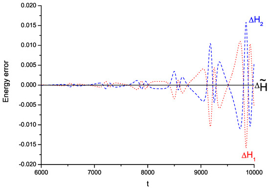 The energy errors of the Hamiltonian in Equation (16), as computed using the algorithm after the extended phase space, can be expressed as , whereas and represent the value of the Hamiltonian at time t. denotes the initial value of the Hamiltonian in Equation (16). Time–axis symmetry exists between (red dot) and (blue dash).