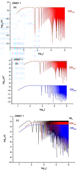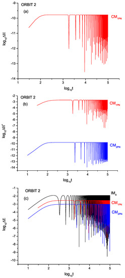 To validate the aforementioned conclusion, additional numerical simulations will be conducted in a different orbit, referred to as orbit 2. The initial conditions for orbit 2 are set as . In Figure 4, three categories of energy error in orbit 2 will be depicted as follows: (a) Energy error analysis of orbit 2 for , , and will be presented in Figure 4a. (b) Figure 4b will display the energy error analysis of orbit 2 specifically for . (c) The energy error analysis of orbit 2, focusing on , will be illustrated in Figure 4c.
