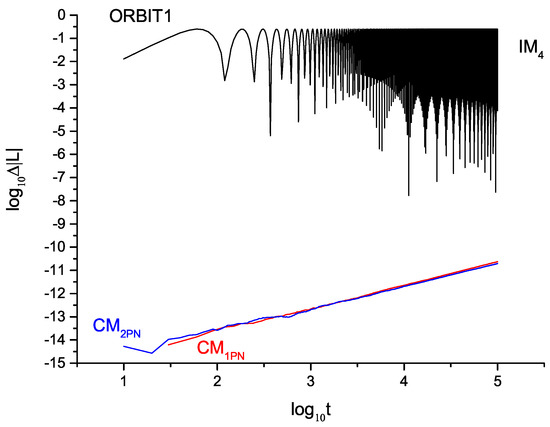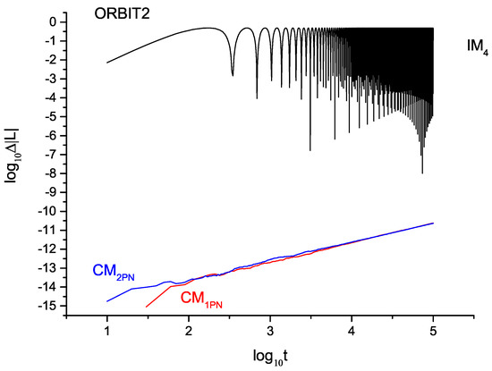 The PN Lagrangian equations of motion are derived from the Euler–Lagrangian equations of a PN Lagrangian formulation, denoted as . By calculating the partial derivative of L with respect to velocity, we obtain the generalized momentum . Similarly, the acceleration equations can be derived and we can obtain a coherent Lagrangian [18,19,20]. By limiting the inclusion of accelerations up to a certain PN order in the Lagrangian, the accelerations in the function f will be modified to ; it only has lower-order terms, i.e., .The acceleration equations become incoherent, due to the higher-order PN terms disappearing, leading to a loss of some values of the constants of motion during subsequent evolution. The same problem occurs with the post-Newtonian Hamiltonian form. The error of the constant of motion can be used as an indicator to test the performance of different algorithms in both approximate forms.