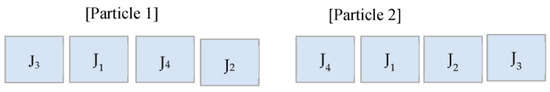 Representing a particle phase tries to translate a solution to the FSSP into a particle (or ant). In this problem, a position in a particle represents a job number, and the number of positions (i.e., particle size) corresponds to the number of jobs, as shown in Figure 1. For example, consider particle 2 (J4 → J1 → J2 → J3). The J4 is scheduled on the corresponding stage and assigned to a machine that can complete J4 at the earliest completion time. Then the J1 is scheduled, and so on.