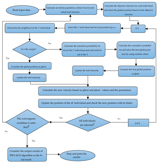 - Steps in Hybrid ACO-PSO Optimization AlgorithmThe steps of the proposed method are described in the following [71]:Step 1: Receiving the inputs.