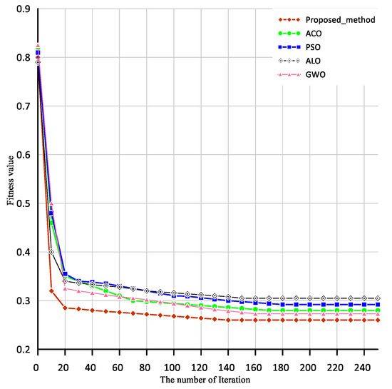 Table 4 determines which proposed method has the least performance and which has the most. The table shows that the mean ranks of the GWO, ALO, ACO, and PSO algorithms were 2.19, 2.06, 1.99, and 1.86, respectively. However, the average of the proposed method was 2.25, indicating that the proposed method was now more efficient.