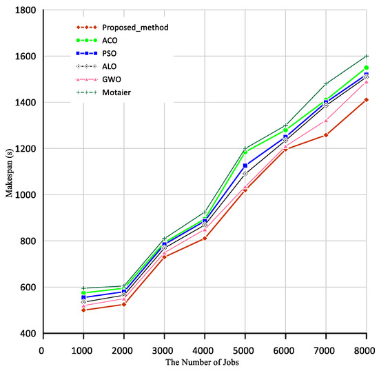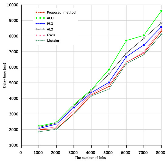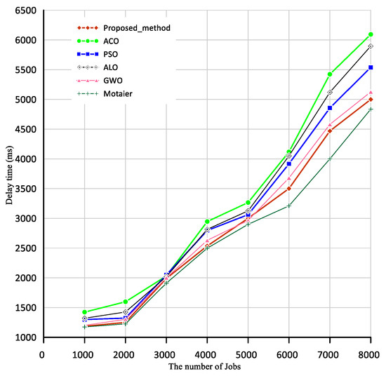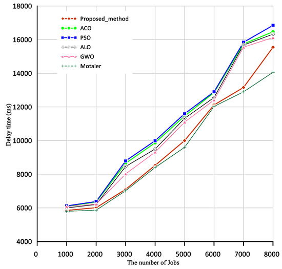 The issue of the FSSP is one of the main issues when trying to determine optimal scheduling for executing tasks and allocating optimal resources. The main focus of this article is minimizing delay and reducing makespan in symmetric networks. To compare the efficiency of the proposed method, the Ant Lion Optimizer (ALO) algorithm, Grey Wolf Optimization (GWO), ACO [72], PSO [42], and Motair [36] were taken into account. The values used as simulation parameters in MATLAB were considered according to Table 2. The method was implemented with tasks ranging from 2000 to 8000 in three different scenarios. The distribution was considered uniform. The efficiency of the approach was compared to the ACO-PSO algorithm in terms of delay time and makespan parameters. A comparison of evaluation parameters is discussed below.