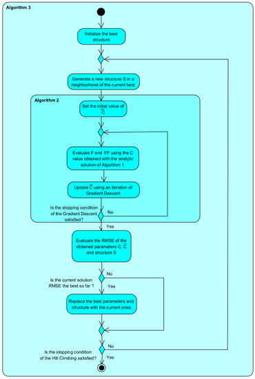 The third and outermost algorithm is the main algorithm, a hill climber that calculates the fitness of each structure as the RMSE of the best possible parameters , by using the second algorithm.