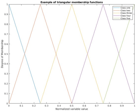 In order to reduce the number of parameters, and to solve the problem optimally, it was decided to force the membership functions to be symmetric, with equispaced centers, as shown in Figure 2. As the data were normalized between 0 and 1, in the case of using two membership functions, their centers would be found at 0 and 1, while for three membership functions, their centers would be at 0, 0.5 and 1, respectively. In general, the ith centroid position was computed using Equation (22), where p was the number of fuzzy sets in the partition: