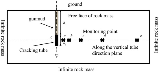 Before supercritical CO2 blasting, the fission tube is typically placed inside a pre-drilled hole, and then the hole is sealed for blasting. Figure 1 illustrates the arrangement of the fission tube, with a length of h2. The ground level is situated h1 above the fission tube, while the front represents the critical surface, and the remaining direction corresponds to the infinite rock body. Upon igniting the fission tube for supercritical CO2 blasting, a stress wave, specifically a P-wave, is generated in the rock body due to the impact pressure of the gas. The propagation process of the P-wave produces various effects on the ground surface, forming the basis for studying the velocity of the blasting vibration.