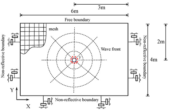 The supercritical CO2 cracking tubes are arranged in the manner shown in Figure 3. The buried depth of the fracturing tubes is 3 m, the resistance line from the free surface is 2 m, the model size is 4 × 6 × 0.01 m, and the fracturing hole diameter is 0.1 m. The non-reflective boundary is used to avoid the reflection of the stress wave on the calculated boundary, except on the free surface. We can calculate the ground vibration caused by CO2 fracturing by applying a fracturing pressure curve to the fracturing hole. Measuring points are set up at the horizontal distance of 0.5, 1.0, 1.52, 2.0, and 2.5 m to monitor the horizontal and vertical closing velocities at each point.