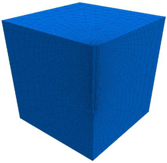 In the modeling process, SOLID164 solid cells are used to simulate the rock mass; each cell has eight nodes, and the vibration effect of the rock mass can be fully displayed through the node displacement. After the trial analysis, the mesh size of the rock body near the rock burst hole is divided into 20 mm, the mesh size of the rock body far from the burst hole is divided into 100 mm, and the finite element model is shown in Figure 4. At the same time, in order to improve the calculation efficiency, we must fully consider the symmetry of the calculation model, and only let the 1/4 model be involved in the calculation. The calculation model is shown in Figure 5.