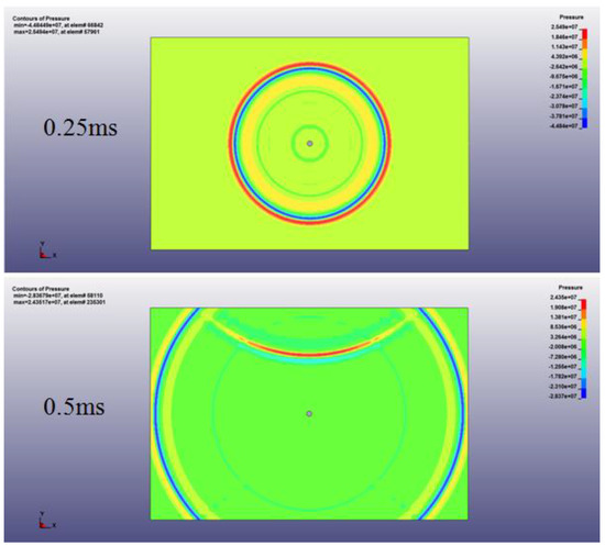 Using the node merging method, the parameters of a 0.25 kg typical RDX-based explosive and the drilling parameters of the same rock are calculated using LS-DYNA, and then the pressure–time history curve of the wall detonation of RDX-based explosives can be obtained, as shown in Figure 11. As shown in the figure, the explosion pressure is also triangular, but the peak pressure is about 812.5 MPa, and the fracturing pressure duration is about 200 us. It can be seen that the peak pressure of explosive blasting is 3.36 times that of phase change cracking, but its action time is only 1/100 of that of phase change cracking.