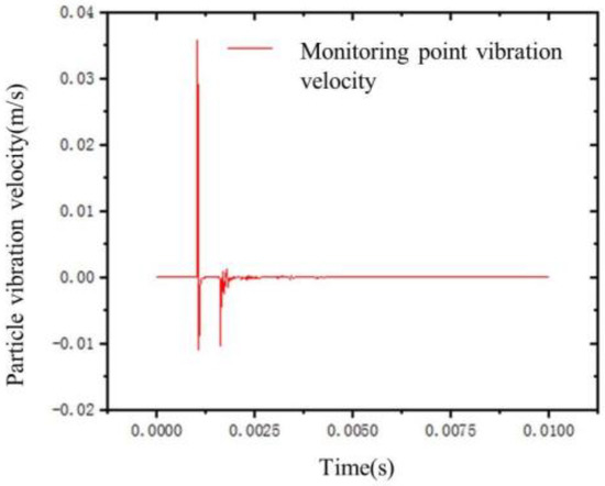 A monitoring point was set at (0.2,0.2,0) coordinates, i.e., 0.282 m from the center of the fracturing hole, to monitor the vibration velocity of the surface plasma point after supercritical CO2 blasting, and the time curve of the vibration velocity of the plasma point was obtained, as shown in Figure 7. As can be seen from the figure, the vibration velocity of the mass appeared two peak points, respectively, in 1.0 ms and 1.7 ms, the maximum vibration velocity of 3.56 cm/s. The second peak point is due to the vibration of the mass caused by the reflection of the stress wave at the critical surface and then returned to the measurement point.