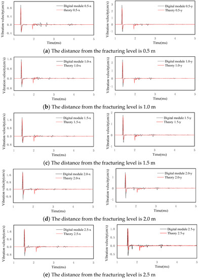The vibration velocity of each point on the free surface is calculated using the time-domain recursive method programmed with Matlab, and using numerical simulation. Additionally, the normal (Y) and tangential (X) particle vibration velocities at each measuring point are shown in Figure 8.
