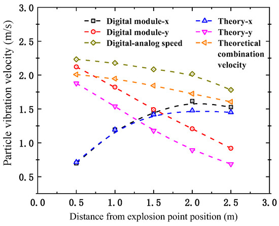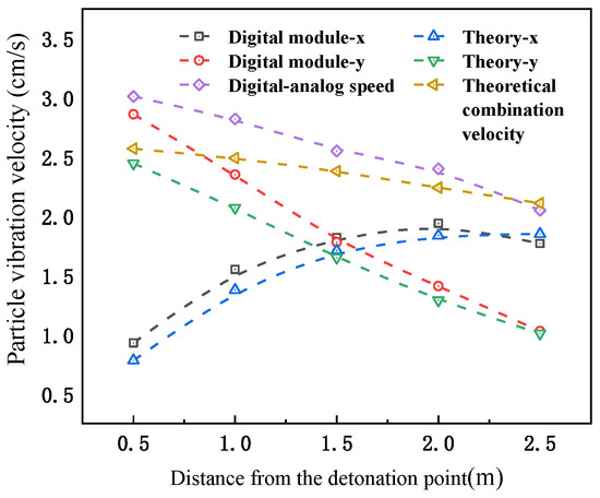 The variation rule of the peak velocity of each measured point with fracturing distance obtained via the theoretical model and numerical simulation is shown in Figure 9. From the figure, it can be seen that the peak velocity obtained using theoretical calculation and numerical simulation is consistent; the normal velocity decreases linearly and rapidly with distance, the tangential velocity increases exponentially with distance, and the combined velocity decreases linearly.