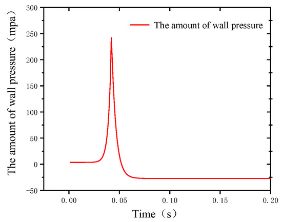 According to the results of the literature [25], the volume size of a type-85 fracturing tube is 1597.97 cm3, the liquid charge size is 1210 g, and the fracturing peak pressure is 242.09 mpa. The pressure–time curve of the type-85 fracturing tube in the process of fracturing the rock is shown in Figure 10, and it can be seen from the figure that the fracturing pressure is triangularly distributed, the peak fracturing pressure is about 242.09 MPa, and the pressure duration is 0.02 s.