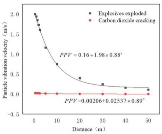 However, the ground vibration caused by supercritical CO2 cracking is quite different from that caused by dynamite blasting after equivalent substitution. The following Figure 13 shows the attenuation curve of particles with increasing distance caused by supercritical CO2 cracking and dynamite blasting.