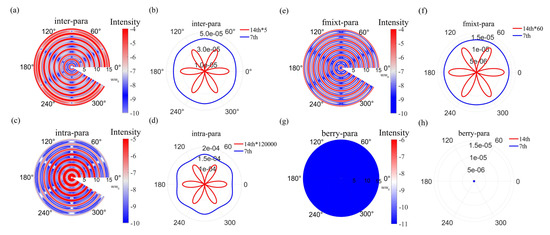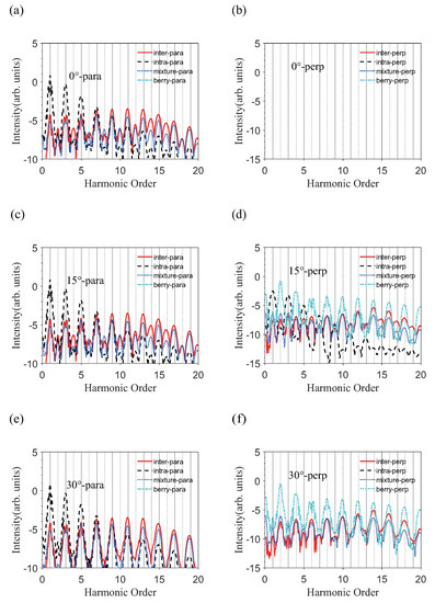 Figure 5 compares the intensity of the HHG induced by the four different mechanisms. In Figure 5a,c,e, we note that the intensity of parallelly polarized components of the HHG induced by the mixture term (dark blue) is almost the same as the one induced by the inter-band polarization (red) above seventh-order harmonics and also very closely below the seventh-order harmonics, respectively at 0, 15 and 30. Additionally, the HHG induced by intra-band currents takes a dominant position above the seventh-order harmonic in the orientation of parallel polarization and becomes smaller than those induced by inter-band polarization and the mixture term below seventh-order harmonics. Similar to the parallelly polarized components, in Figure 5b,d,f, the intensity of perpendicularly polarized components of the HHG induced by the mixture term (dark blue) is nearly identical to the one induced by the inter-band polarization (red) above 10th-order harmonics and also approximate to that below 10th-order harmonics, respectively, at 0, 15 and 30. What is different is that, in Figure 5b,d,f, the HHG induced by anomalous currents caused by Berry curvature has the highest intensity in the orientation of perpendicular polarization during the four different mechanisms. Thus, the mixture term HHG cannot be ignored any more in future investigations, especially with regard to the parallel components.
